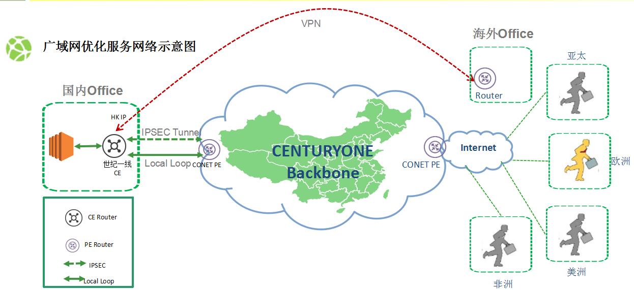 创科技术通信在国内和海外均有POP点,为客户端提供本地线路或者利用客户现有互联网线路,创科技术通过在客户端提供的高性能CPE路由器, 为客户建立加密VPN通道连接到创科技术大陆端PE路由器。同时创科技术在机房端为客户开通广域网优化线路。